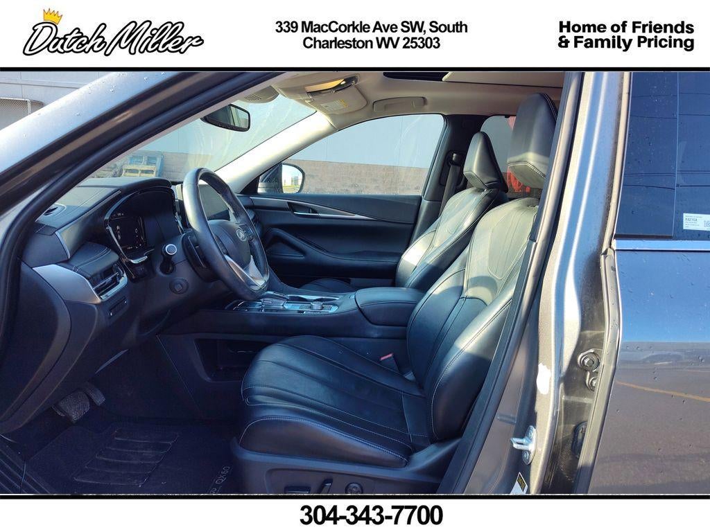 Experience refined luxury and confident performance with this 2022 INFINITI QX60 LUXE, now available in South Charleston, WV. Finished with premium leather seats and an elegant interior, this three-row luxury SUV pairs comfort with capability thanks to its silky-smooth 3.5L V6 gasoline engine and responsive AWD system. Whether you're navigating snowy West Virginia roads or cruising the highway, the INFINITI QX60 delivers composed handling and strong passenger comfort for every journey. This INFINITI QX60 LUXE is equipped with advanced technology designed for convenience and safety. Built-in navigation helps you stay on course, while Hands-Free Bluetooth® and XM Radio keep passengers connected and entertained on long drives. Proactive safety features such as Forward Collision Warning add peace of mind by helping you anticipate and respond to changing traffic conditions. Thoughtfully maintained and competitively priced, this INFINITI represents the best price in the area for comparable models—an exceptional value for buyers seeking luxury, technology, and AWD capability. Ideal for families, commuters, and anyone who values refined styling and practical features, this SUV pairs versatility with upscale amenities. Visit our South Charleston, WV location to see the vehicle, take a test drive, and experience firsthand the comfort and performance of this 2022 INFINITI QX60 LUXE. Financing options are available for qualified buyers.